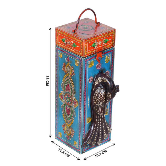 Artisan Hand-Painted Wooden Wine Box with Decorative Peacock Figurine