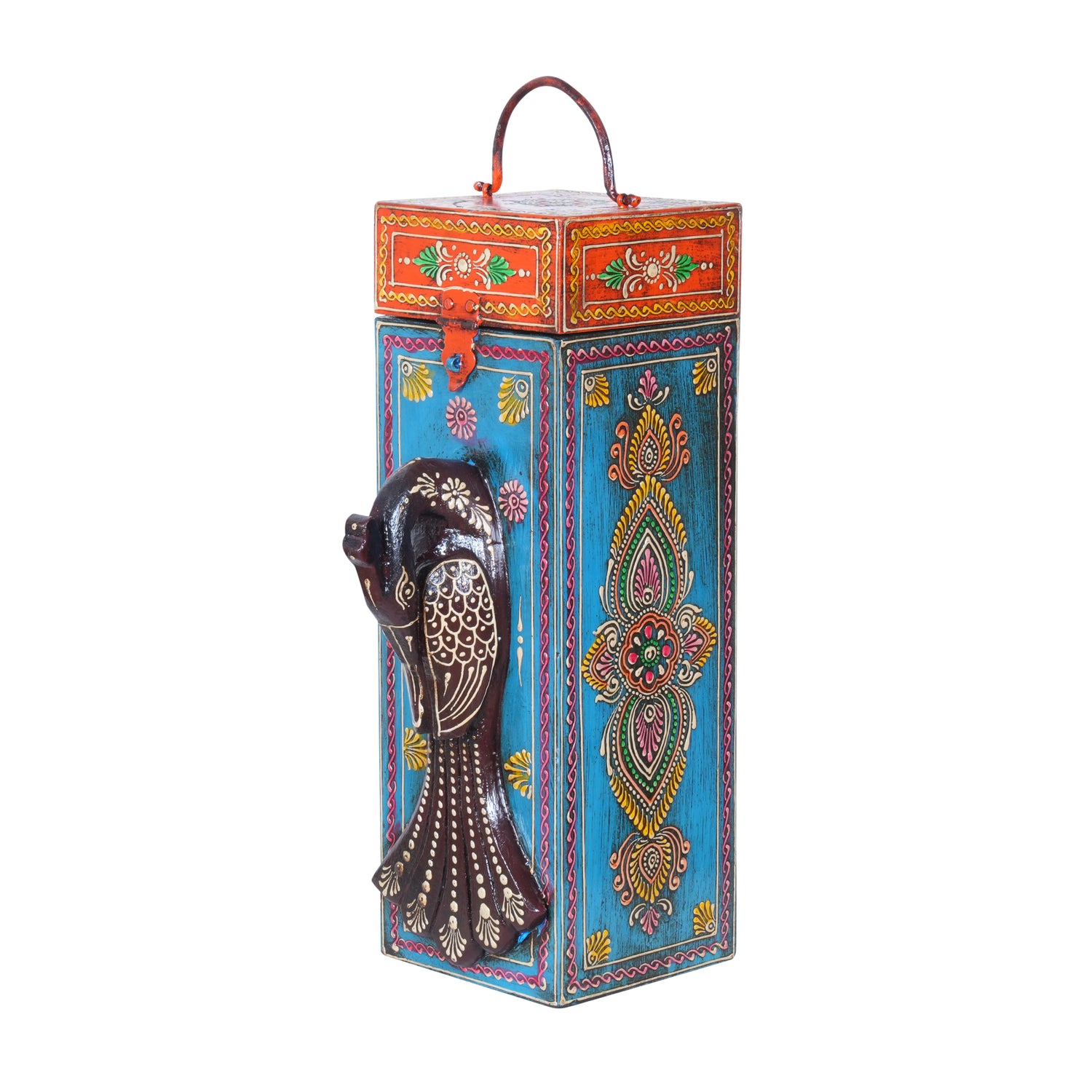 The tall, rectangular box is completely covered in intricate, hand-painted patterns featuring classic motifs like paisleys and florals, set against a vibrant background and bordered by black and gold detailing. The most striking feature is the three-dimensional carved peacock figurine that proudly adorns the front, painted in rich, contrasting colours to create a captivating centrepiece.