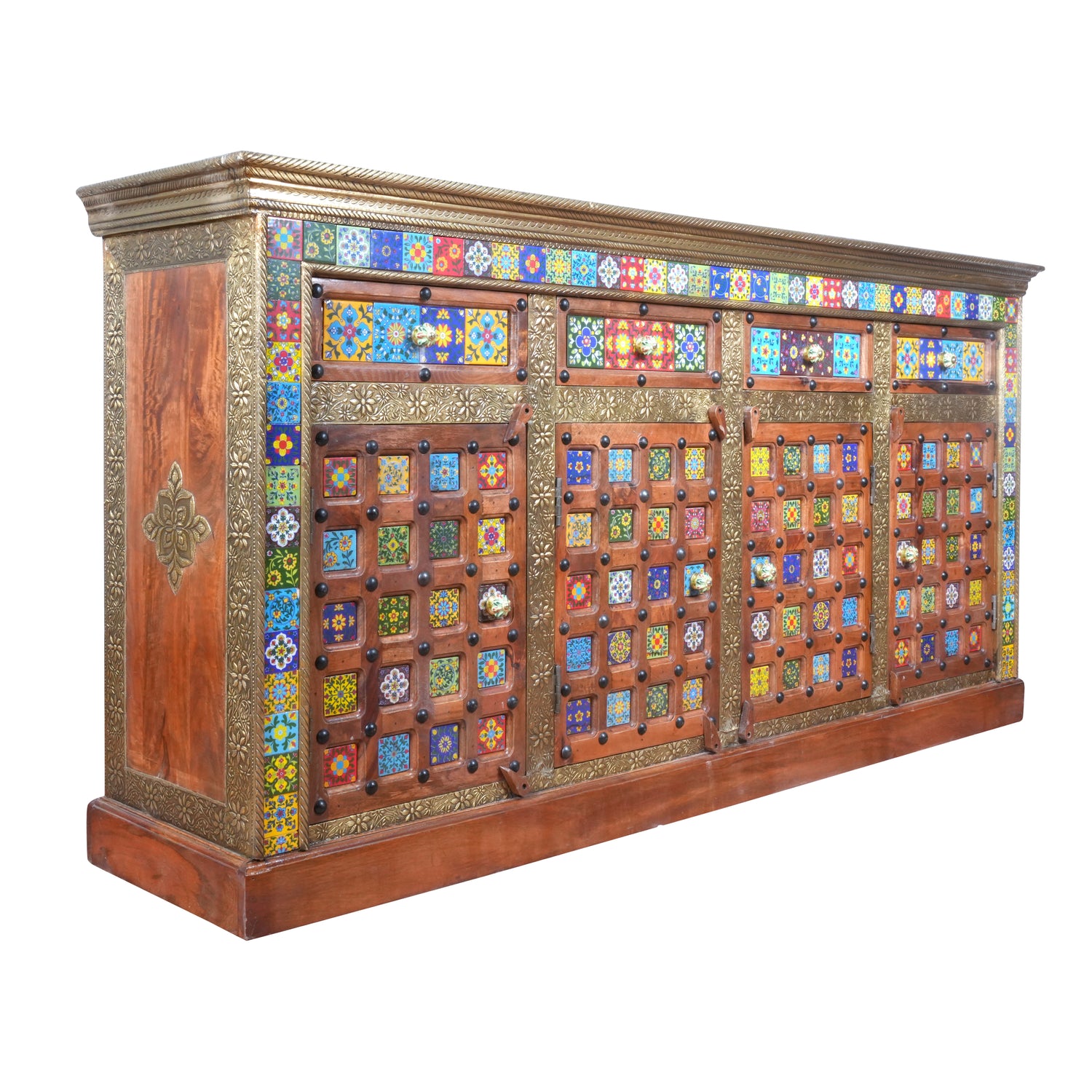 This impressive piece is a large wooden sideboard or console cabinet, distinguished by its extensive use of vibrant ceramic tiles and ornate brass accents. Designed for substantial storage, it makes a striking statement as a dining room server, media console, or entryway cabinet.
