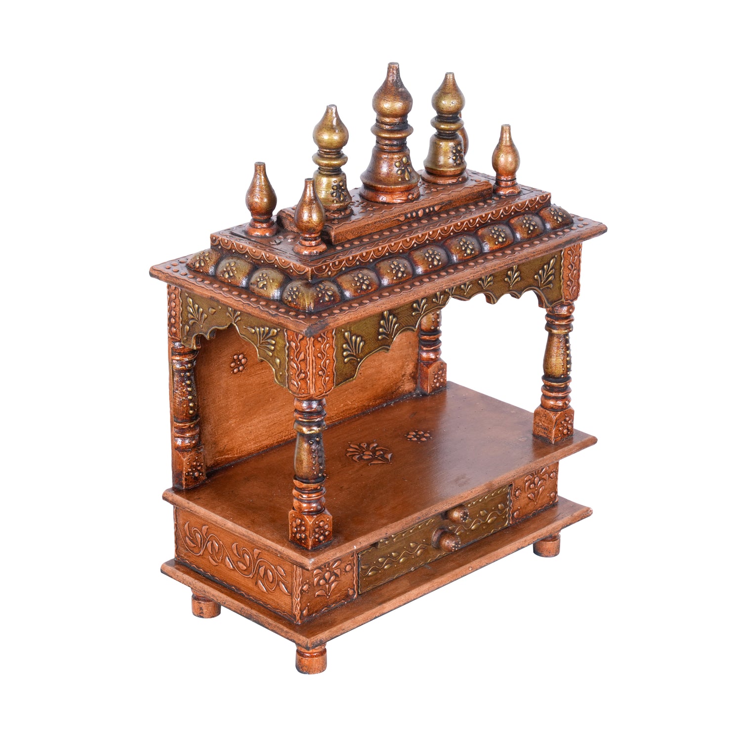 The temple is meticulously crafted from wood, featuring an ornate tiered structure with decorative peaks (shikharas) and a detailed archway. The entire structure is finished in a luminous copper-tone paint, which dramatically highlights the intricate carving across the pillars, side panels, and the decorative arch. The design is reflective of the Rajput-era temple architecture from Rajasthan, celebrated for its detailed, ornate patterns. A small pull-out drawer at the base provides discreet storage for incense, matches, or prayer accessories.