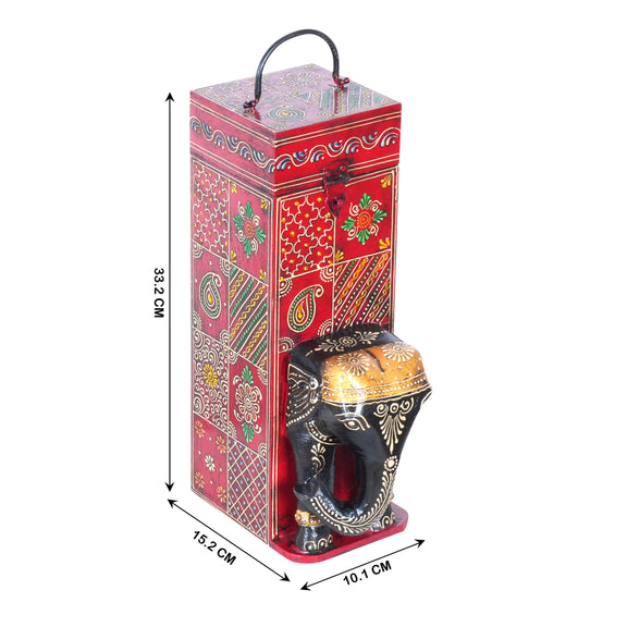 The tall, rectangular box is painted in a vibrant, rich red and features intricate, hand-painted patchwork patterns consisting of detailed paisley, floral, and geometric motifs. Adorning the front is a majestic, sculpted elephant figurine painted in a contrasting black with elaborate golden embellishments.