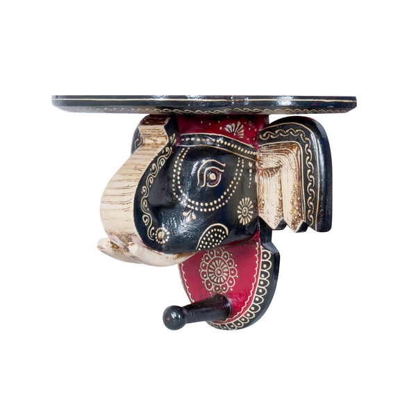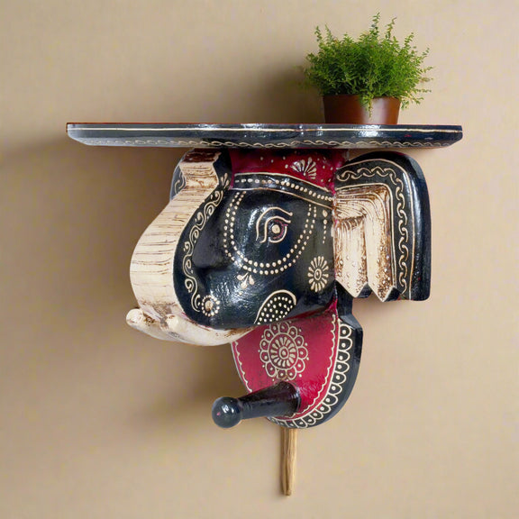 The bracket is crafted from wood and features an intricately carved and painted elephant head that serves as the main support. The elephant and its support piece are adorned with vibrant hand-painted folk art, utilizing rich colours like black, red, and cream, accented with detailed patterns and traditional motifs.