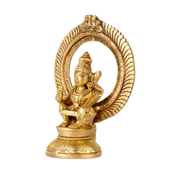 Invoke a sense of discipline and devotion with this meticulously crafted brass idol of Lord Ayyappa. Depicted in his iconic yogic posture with a band around his knees, the deity is framed by a magnificent circular Prabhavali (arch) featuring a decorative Kirtimukha (lion face) at the crest. This piece capture the serene and powerful essence of the "Manikanta" on a tiered lotus pedestal.