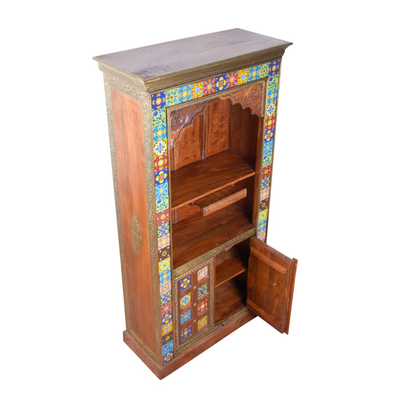 The cabinet is constructed from warm-toned wood, with its vertical edges beautifully accented by a frame of embossed brass sheet panelling and a border of vibrant, multicolour ceramic tiles. The top section features an open display area with a scalloped, arched back panel and an internal shelf, ideal for showcasing décor items.