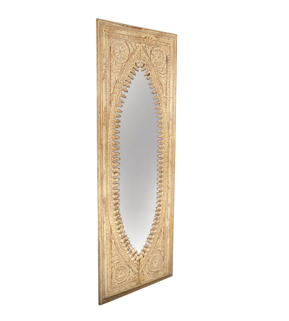 A captivating blend of artistry and functionality, this handcrafted wooden wall mirror showcases the beauty of its intricately carved frame. The unique, almost keyhole shape adds a touch of vintage charm, making it a statement piece for any room.