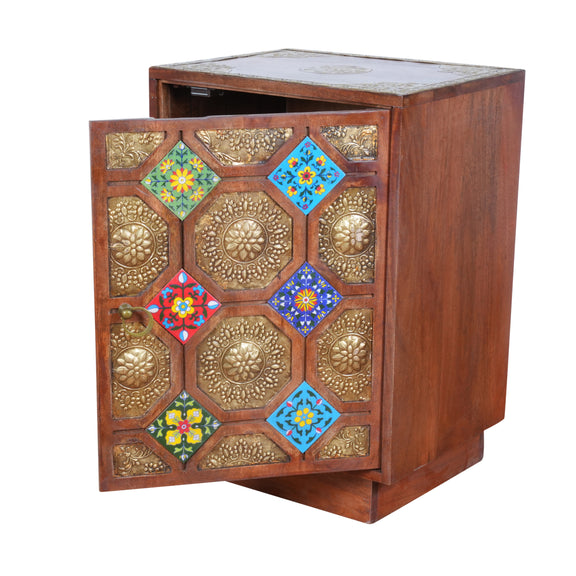 Rustic Wood Bedside Cabinet with Brass & Tile Door | Ethnic End Table