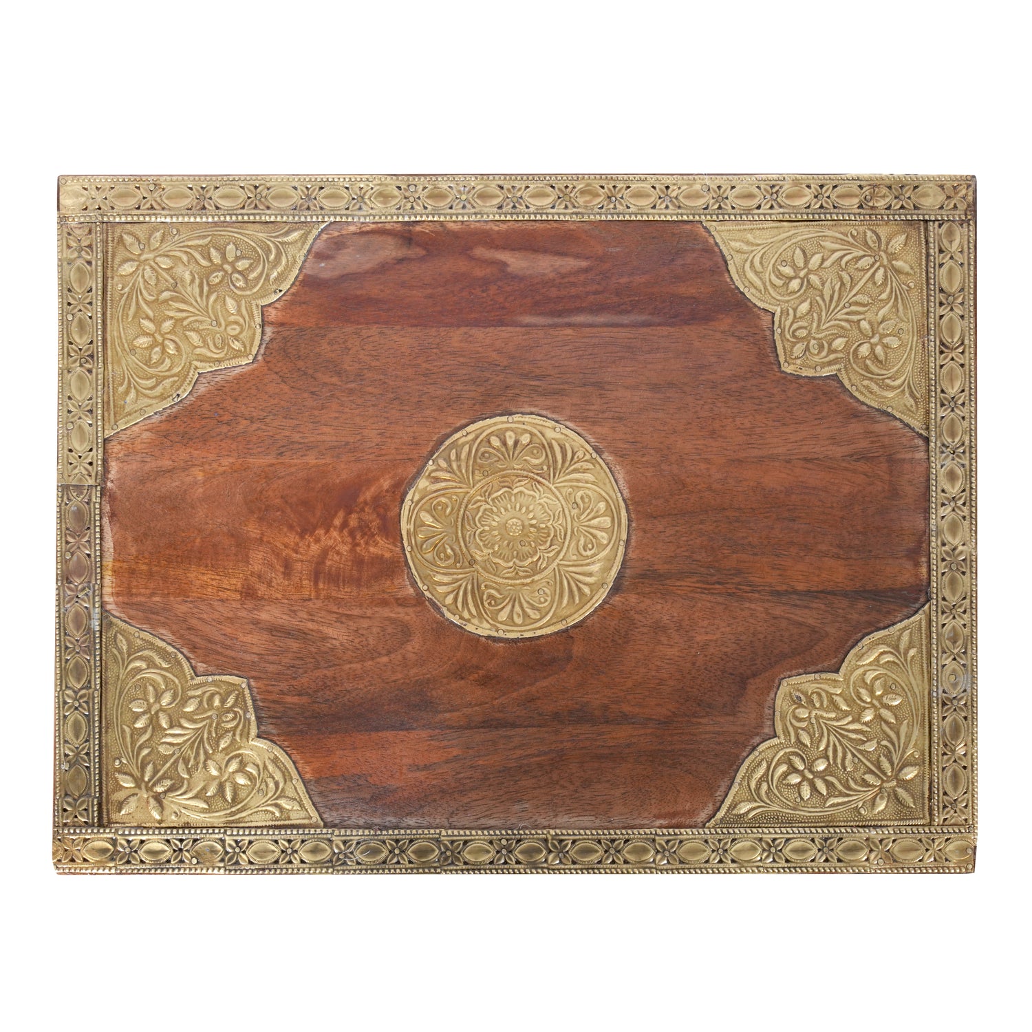 The rich texture of the brass and the bold colours of the tiles are framed by the natural wood grain, giving the piece a robust, antique, and artisanal appearance. This cabinet is a fantastic choice for adding a unique blend of traditional Indian craftsmanship and practical storage to any bedroom or living space.
