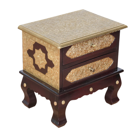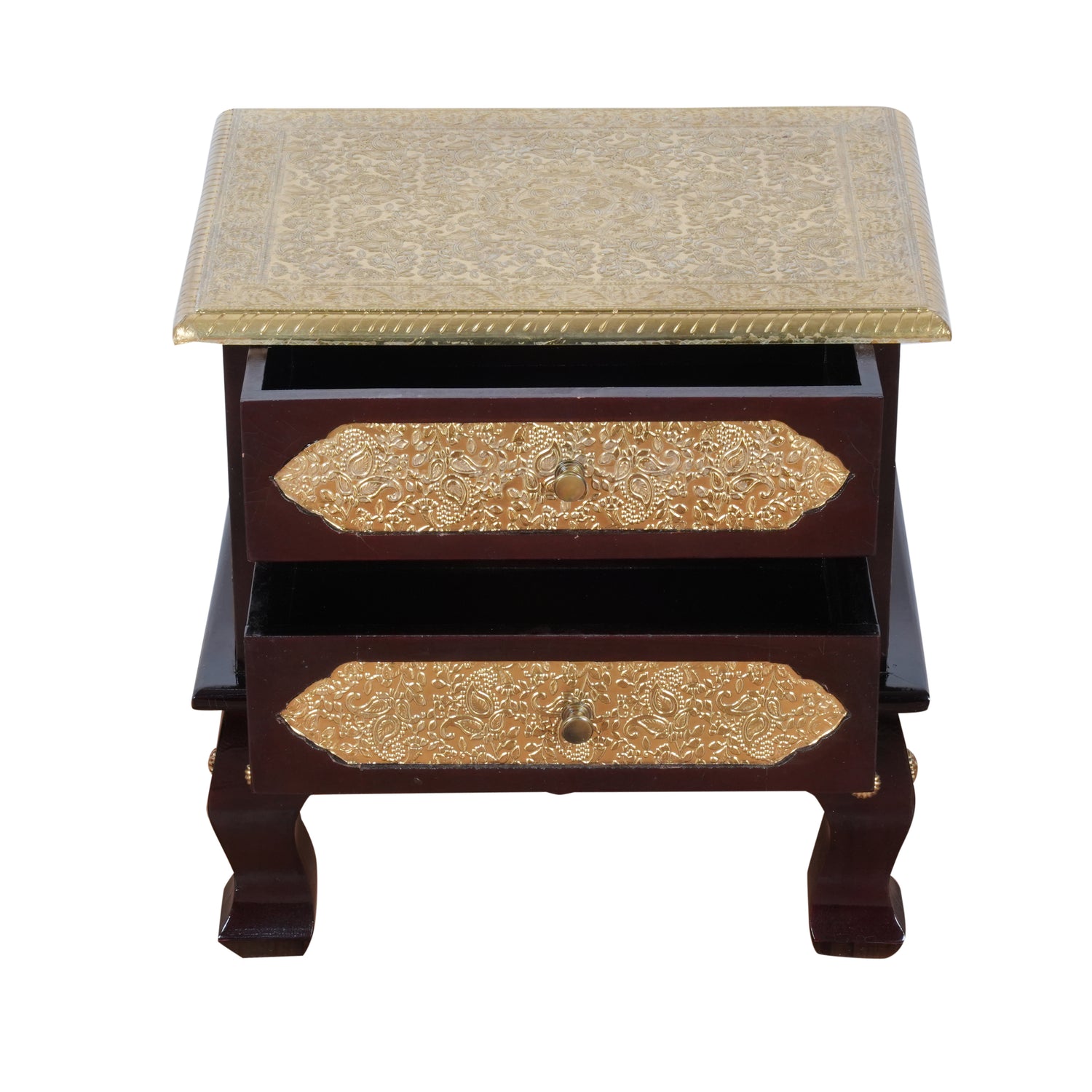 The chest features two spacious drawers for keeping small items, jewellery, or bedside essentials organized. It is crafted from dark-stained wood, giving it a rich, antique look, and stands on elegant, curved legs. The entire top surface is overlaid with an intricately embossed brass sheet featuring detailed floral patterns, and the drawer fronts are beautifully decorated with large, ornate brass panels. The combination of dark wood and gleaming brass creates a regal, timeless aesthetic.