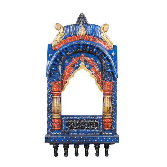 This exquisite piece is a hand-carved and hand-painted wooden Jharokha, functioning as a beautiful wall-mounted niche or a compact home temple (mandir). Its design is inspired by the traditional architectural balcony windows found in the palaces and Havelis of Rajasthan, known for their ornate craftsmanship.