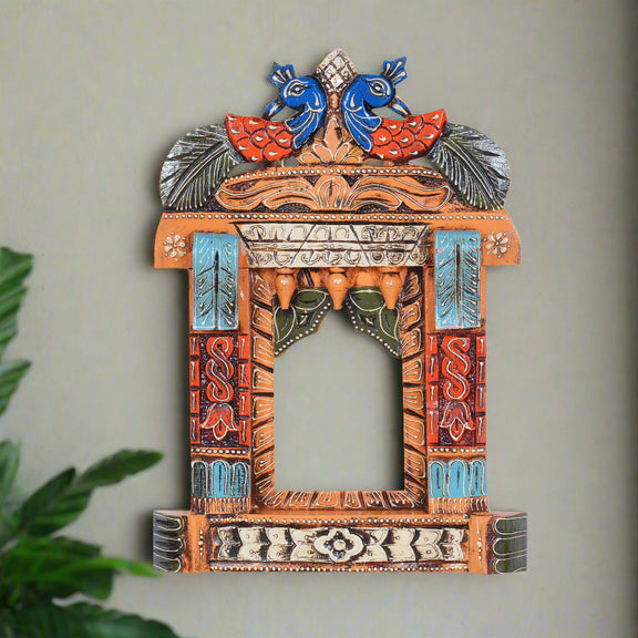 This exquisite piece is a hand-carved and hand-painted wooden Jharokha, functioning as a beautiful wall-mounted niche or a compact home temple (mandir). Its design is inspired by the traditional architectural balcony windows found in the palaces and Havelis of Rajasthan, known for their ornate craftsmanship.